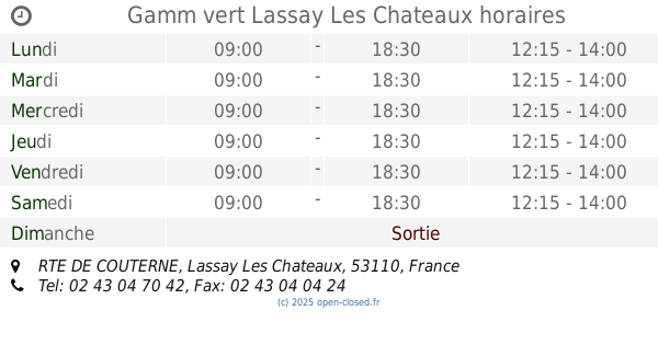Add it to your website, your phone or even your desktop - opening times, phone numbers and the road to Store of the Gamm vert Dans Lassay Les Chateaux, RTE DE COUTERNE.